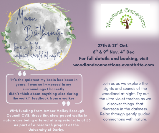 With funding from Amber Valley Borough Council CVS, these 1hr, slow-paced walks in nature are being offered at a special rate of £5 as part of a research project at the University of Derby.