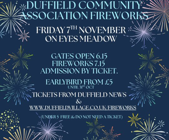 Tickets available from Duffield News or online via Ticketsource: https://www.duffieldvillage.co.uk/fireworks