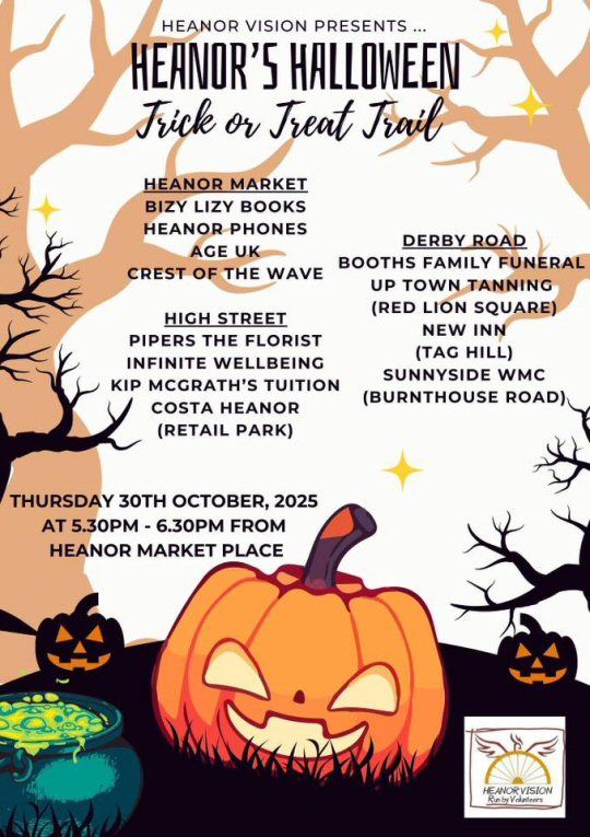 The following shops in Heanor are open for the 'Witching' hour to welcome little monsters and ghouls with a little treat. Including: Noble House, Bizy Lizy Books, Heanor Phones, Age Uk, Crest of the Wave, Cafe Jaks, Burger Wurger, Pipers the Florist, Mystic Realm, Infinite Wellbeing, Kip McGrath's Tuition, Costa Heanor, Booths Family Funerals, Up Town Tanning, New Inn (Tag Hill), Sunnyside WMC, The Foodwarehouse.