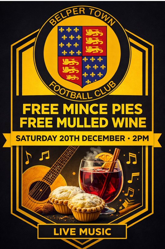 Ahead of our home match versus St. Neots Town, Belper Town FC will be providing free mince pies and mulled wine to all supporters along with a performance of Christmas Carols from Pleasley Colliery Welfare Band.