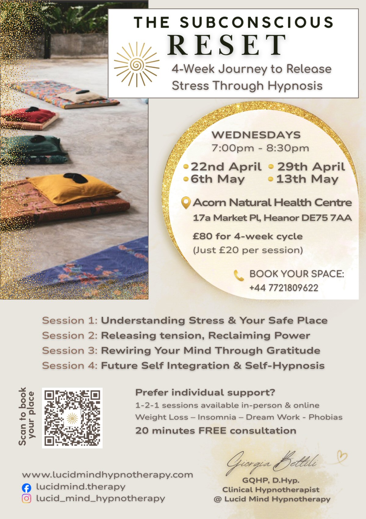 Join a small supportive group to learn practical hypnotherapy techniques that rewire your stress response at a subconscious level. Over 4 Wednesday evenings, you'll understand the science of stress, practise powerful group exercises, and experience deep hypnotic relaxation. Leave with tools you can use for life.