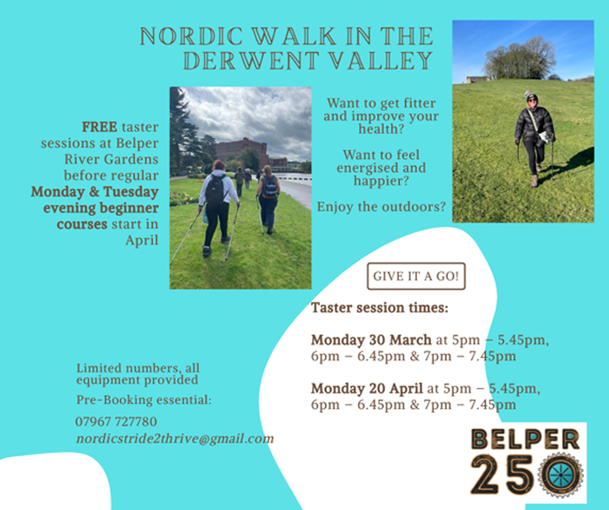 FREE Nordic Walking taster session as part of the Belper 250 celebrations. 3 session times available 17:00–17:45, 18:00–18:45 and 19:00–19:45. Limited numbers, all equipment is provided, pre-booking is essential.