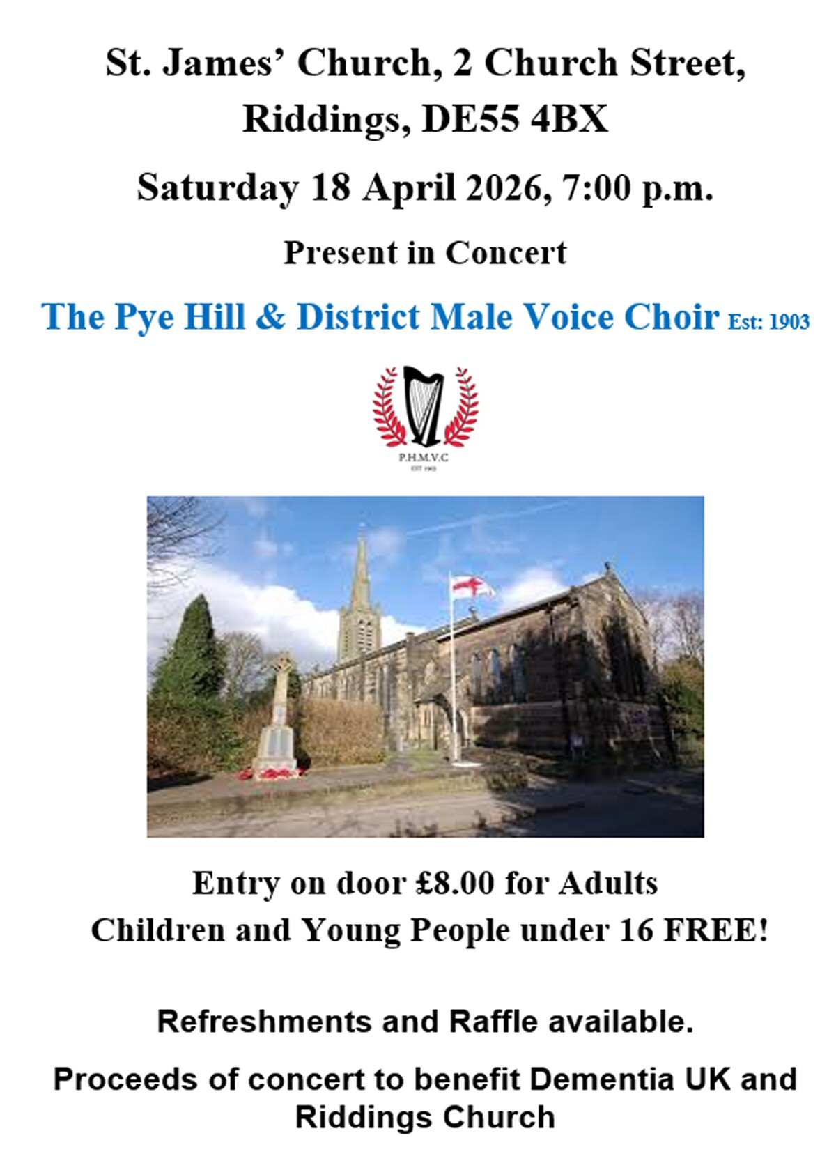 Entry is by payment on the door at £8.00 for Adults. Children and Young People are FREE to help with difficulties families are currently facing. Everyone is welcome! The proceeds of the concert will benefit Dementia UK and Riddings Church. Refreshments and raffle are available.