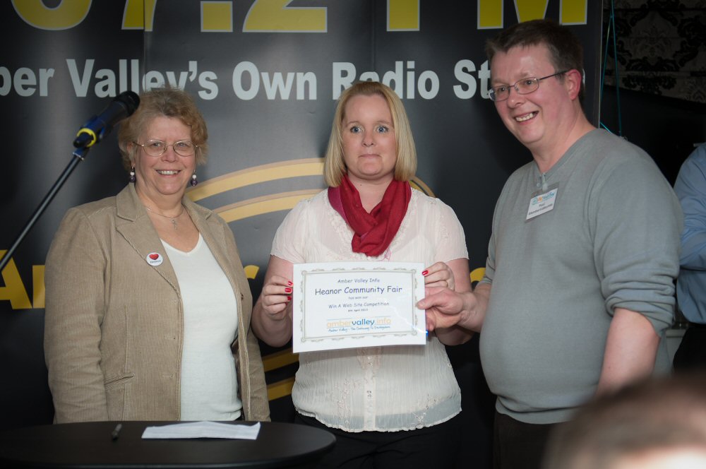 Paul Curran-Bilbie of Amber Valley Info awarding the competition prize to Jane Wells and Sue Clarke of Heanor Community Fair