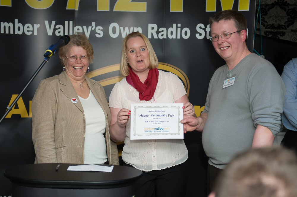 Paul Curran-Bilbie of Amber Valley Info awarding the competition prize to Jane Wells and Sue Clarke of Heanor Community Fair